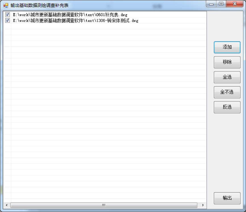 具體功能包括生成測量成果圖、輸出房屋附屬明細表、輸出房屋面積表、定位到房屋編號及打開房屋草圖、將圖框中空白的項目補全、圖框里面的字體全部轉換成宋體、解決文本壓蓋問題、輸出“基礎數據測繪調查補充表、將已經做好的房屋分離出來、服務器上傳與下載數據等批量處理工具。通過批量處理工具,極大提高了三舊改造內業圖形表格處理生成的效率和質量。
